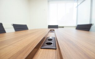 Также — если вы планируете обратиться к производителю мебели и изготовить конференц-стол на заказ, стоит заранее продумать и предусмотреть необходимые элементы мебели, розетки и кабель-каналы для установки техники, чтобы иметь возможность спрятать провода и адаптеры.